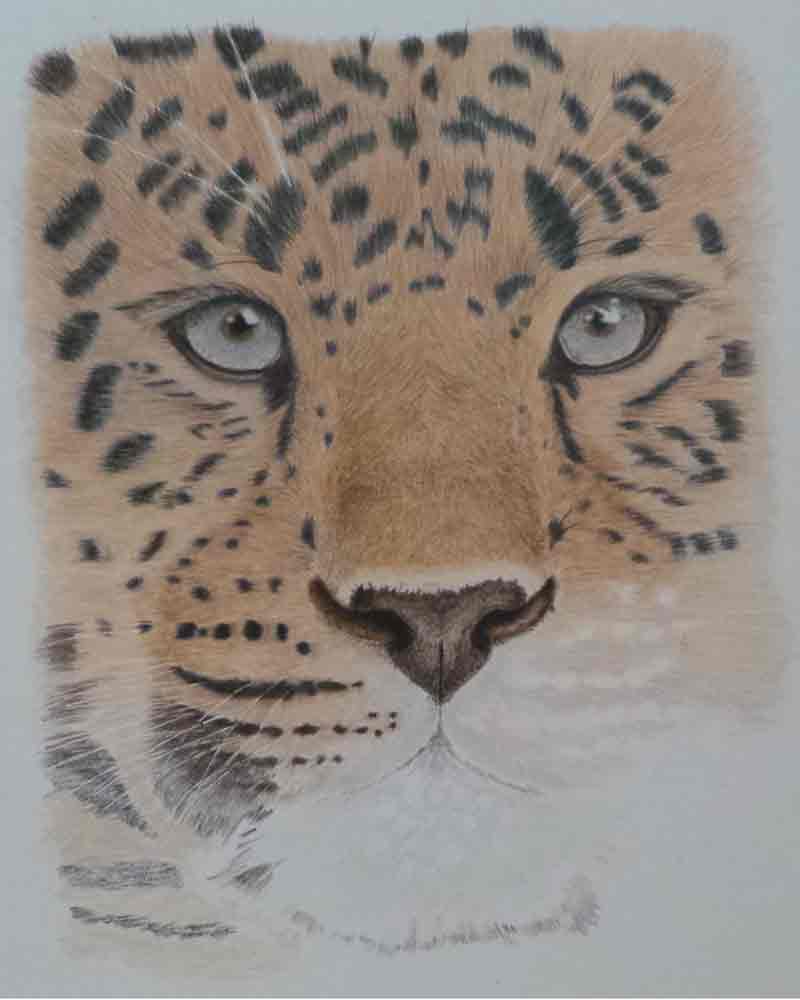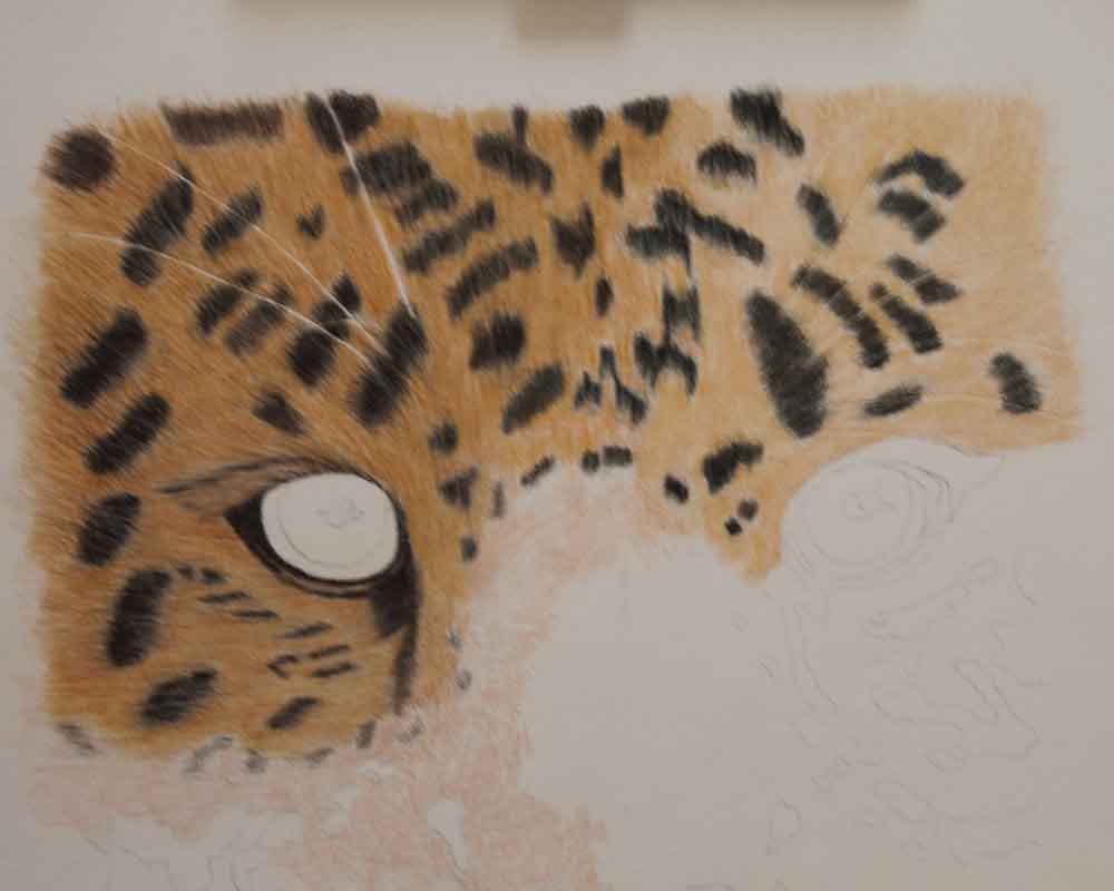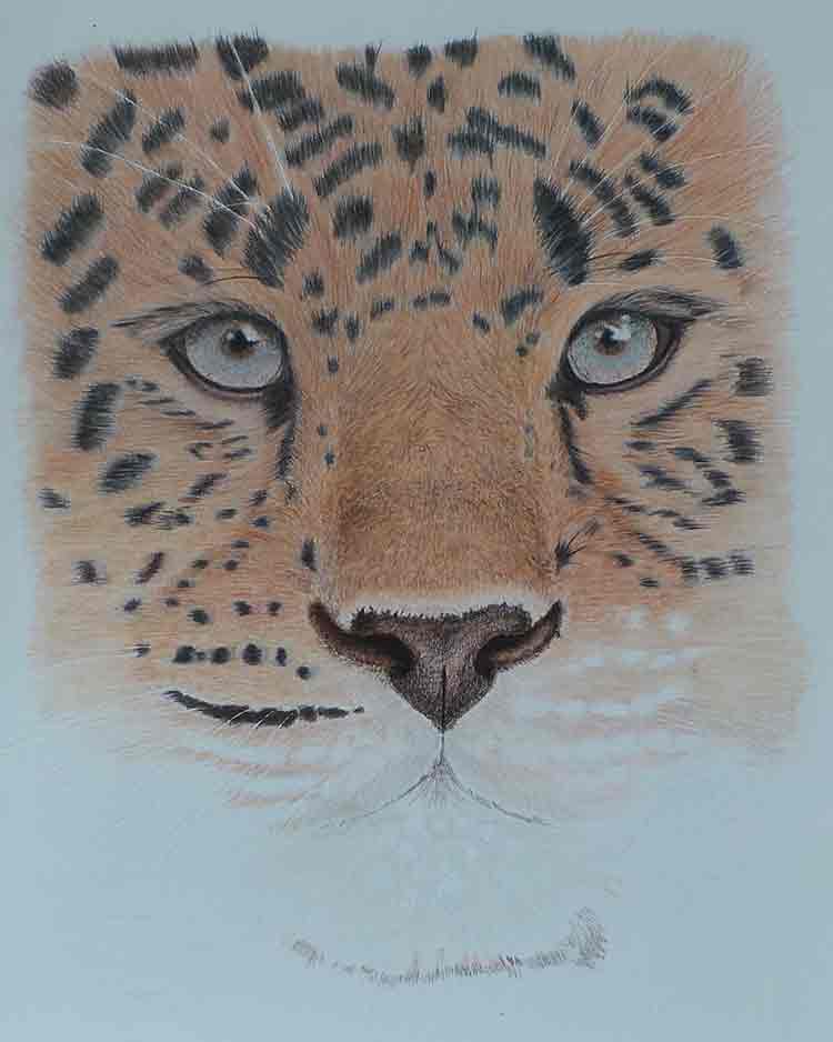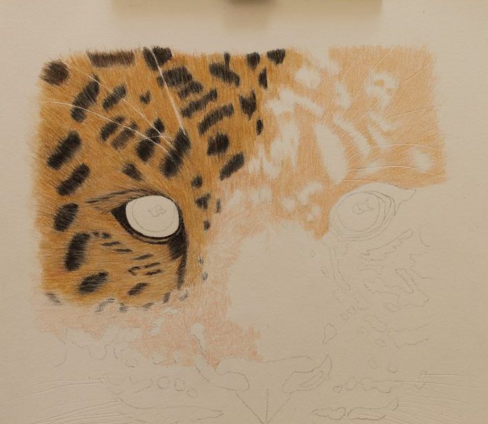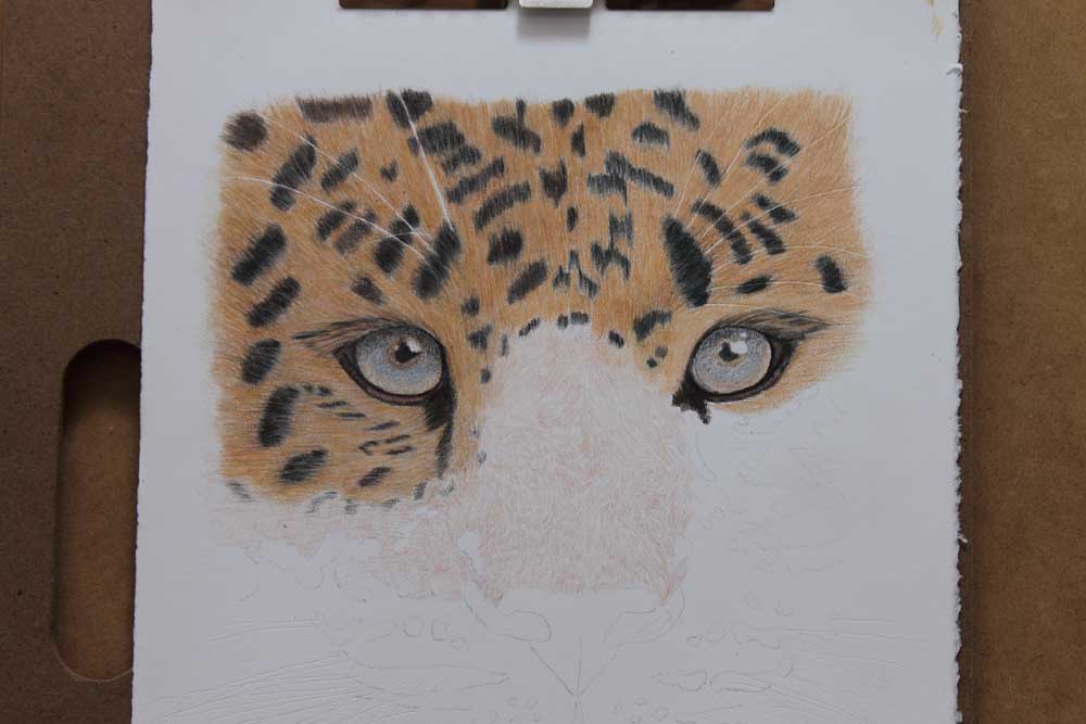 Further layers to end of the nose, built up from light to dark, leaving some of the light areas to show through to try and create some texture. Lighter areas of fur worked on for the bottom half of the portrait. Whiskers have already been placed by using an embossing tool and indenting the paper, so that when subsequent layers of pigment are applied, the pigment flows over the indentations leaving the white of the paper for the whiskers. Using coloured pencils is a very slow process, which makes them ideal to leave out and pick up and use for short periods of time, and in between other pieces of work.