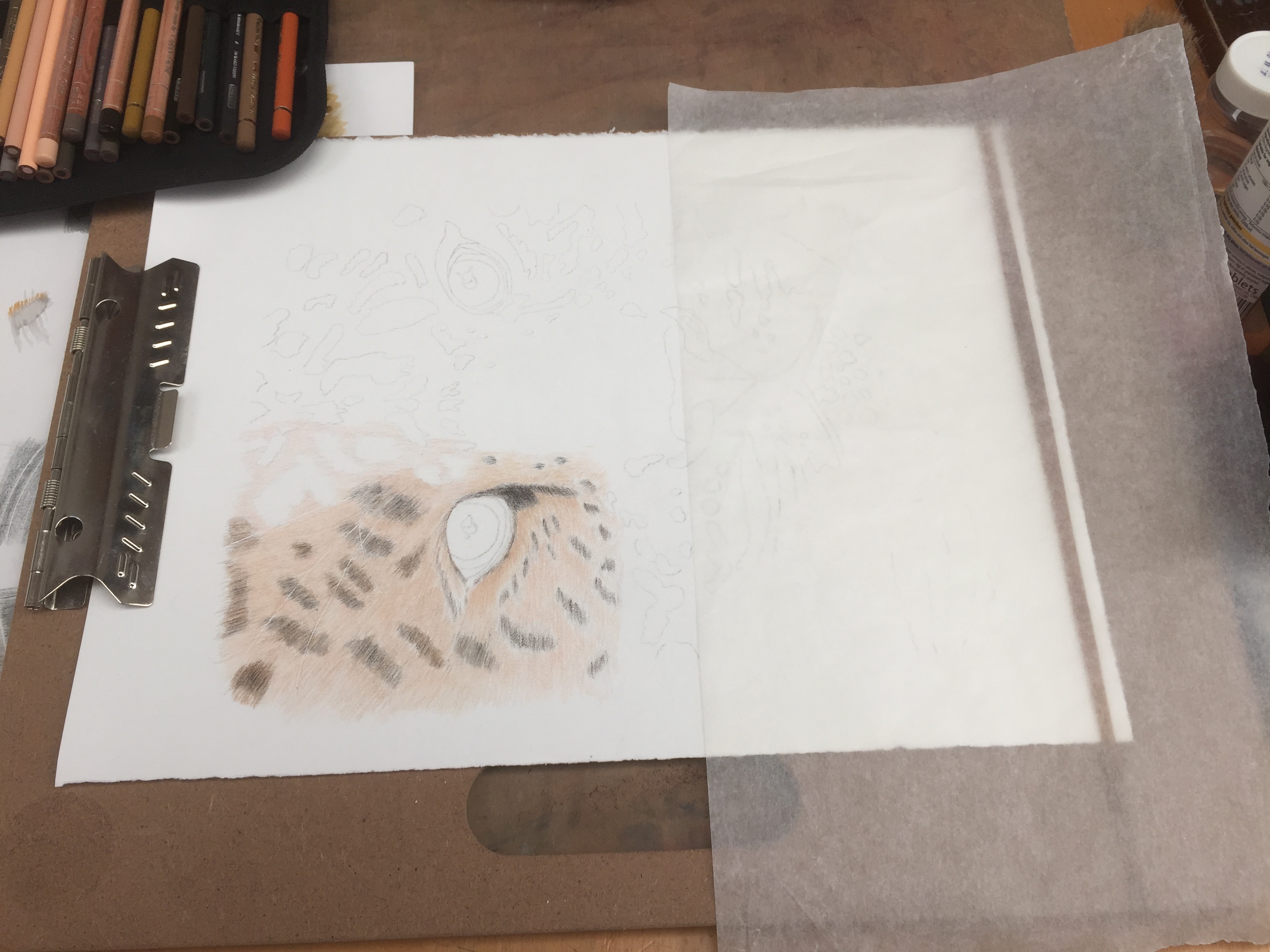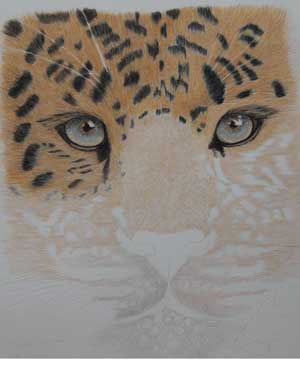 Continuing with layers of pencil now over the embossed whiskers, and paying attention to my reference photo, I slowly work down the left hand side of the face. My reference photograph has been really clear, but as I reach the lowest part of the image, it becomes difficult to see where dark fur commences and ends. So I restrict the amount of the image I can see at any given time, by cutting out a small square in a piece of plain white paper and place this over my reference photo. Placing the cut out area over the part of the image I am working on, acts as a viewfinder and helps with following and drawing the correct section of the image.